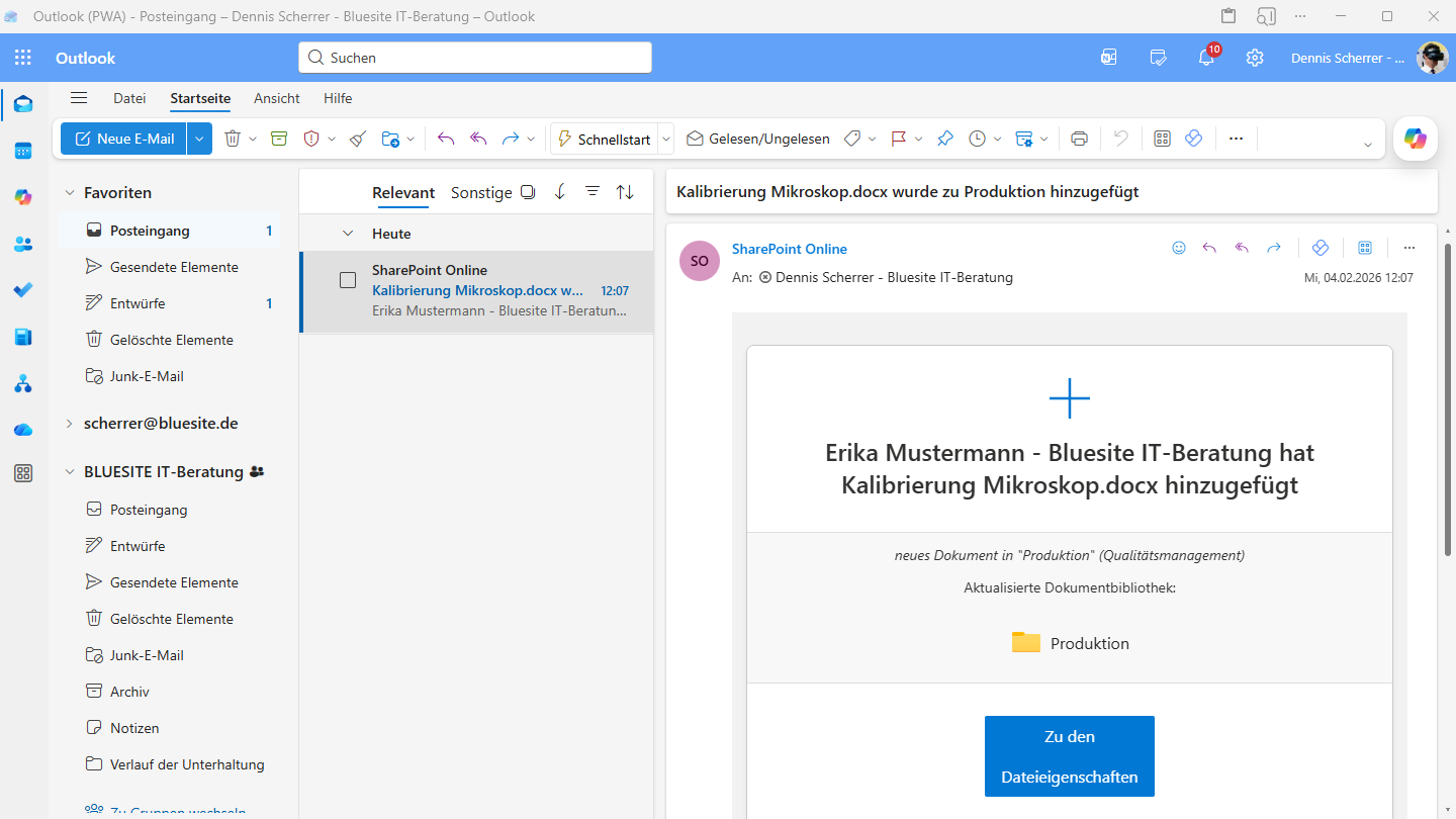 Wird eine neue Arbeitsanweisung hochgeladen, erstellt oder in die Bibliothek „Produktion“ (oder „Dienstleistung“) verschoben/kopiert, sendet SharePoint eine E-Mail. Die mit dem Qualitätsmanagement beauftrage Person kann dann beispielsweise gezielt Unterstützung anbieten und auf Unternehmensrichtlinien hinweisen.