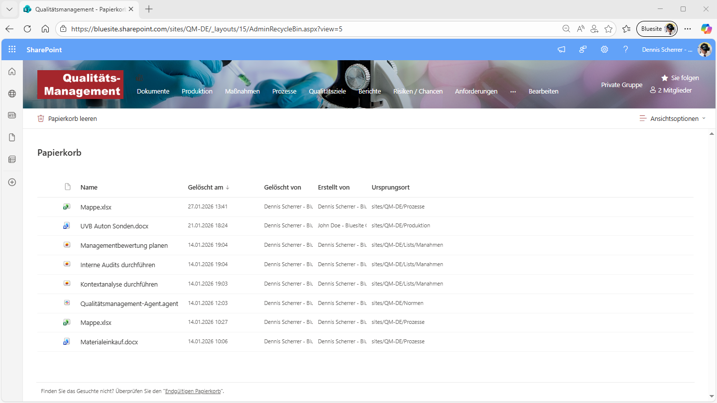 Es kann schon einmal vorkommen, dass ein Mitglied des Qualitätsmanagement-Teams eine ältere Analyse voreilig in der Bibliothek “Berichte” löscht. Gelöschte Dokumente werden in den Papierkorb der SharePoint-Website für das Qualitätsmanagement verschoben. Personen, die vor dem Löschen Zugriff auf die Datei hatten, finden die Datei weiterhin im Papierkorb der Website.
