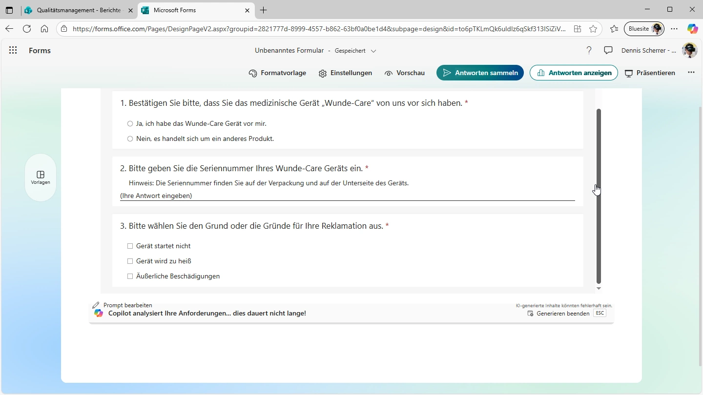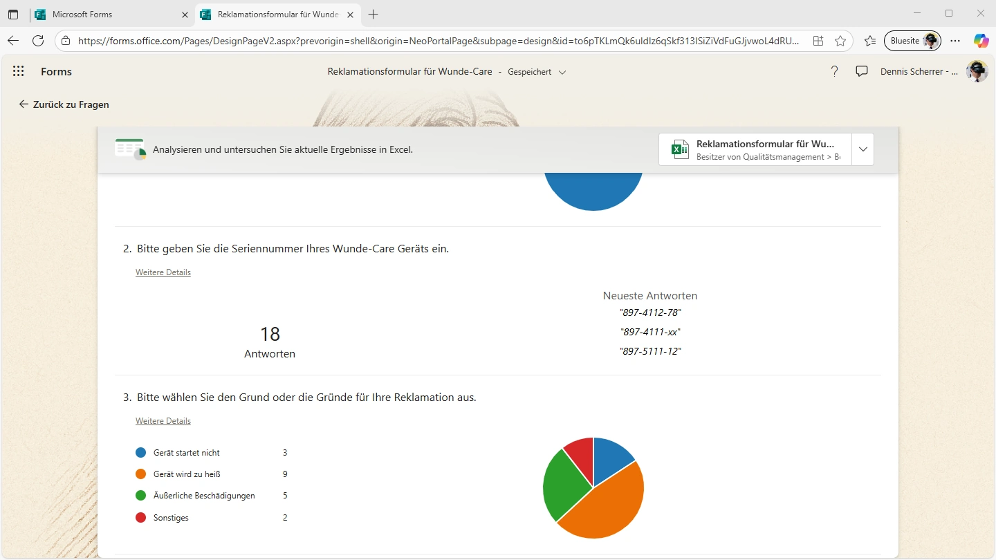 Auf dem Screenshot ist ein Webbrowser mit zwei Tabs zu sehen. Das aktive Tab trägt den Titel "Reklamationsformular". In der Titelzeile des Formular steht links der Hinweis die Ergebnisse mit Excel zu analysieren und rechts ist das Symbol eine Excel-Mapp mit Titel "Reklamationsformular". Darunter sind ist die 2. und die 3. Fragen des Formulars zu sehen. Bei der 2. steht "Bitte geben Sie die Seriennummer Ihres Wunde-Care Geräts ein.", dabei der Hinweis auf 18 Antworten und eine Liste von drei Seriennummern. Bei der Dritten Frage darunter "Bitte wählen Sie den Grund oder die Gründe für Ihre Reklamation aus" sind Gründe aufgelistet und eine Zahl hinter dem Grund. Daneben ist eine Diagramm zur Verteilung der Gründe.