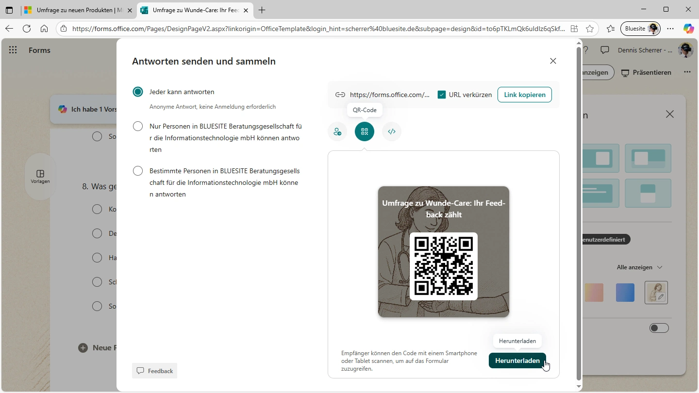 Der Screenshot zeigt Microsofts Edge Webbrowser. In der Adresszeile ist die die URL "https://forms.office.com" zu lesen. Ein Dialog mit dem Titel "Antworten senden und sammeln" verdeckt ein Formular im Hintergrund. Links im Dialog ist die Option "Jeder kann antworten" ausgewählt. Rechts im Dialog ist die URL "https://forms.office.com" zu lesen, daneben die Option "URL verkürzen" aktiviert und die Schaltfläche "Link kopieren". Darunter das Symbol eines QR-Codes – ein Quadrat mit vielen willkürlichen Quadraten darin – ausgewählt. Darunter ein Bild mit der Aufforderung an der Umfrage teilzunehmen und ein vergrößerter QR-Code. Rechts unten die Schaltfläche "Herunterladen".