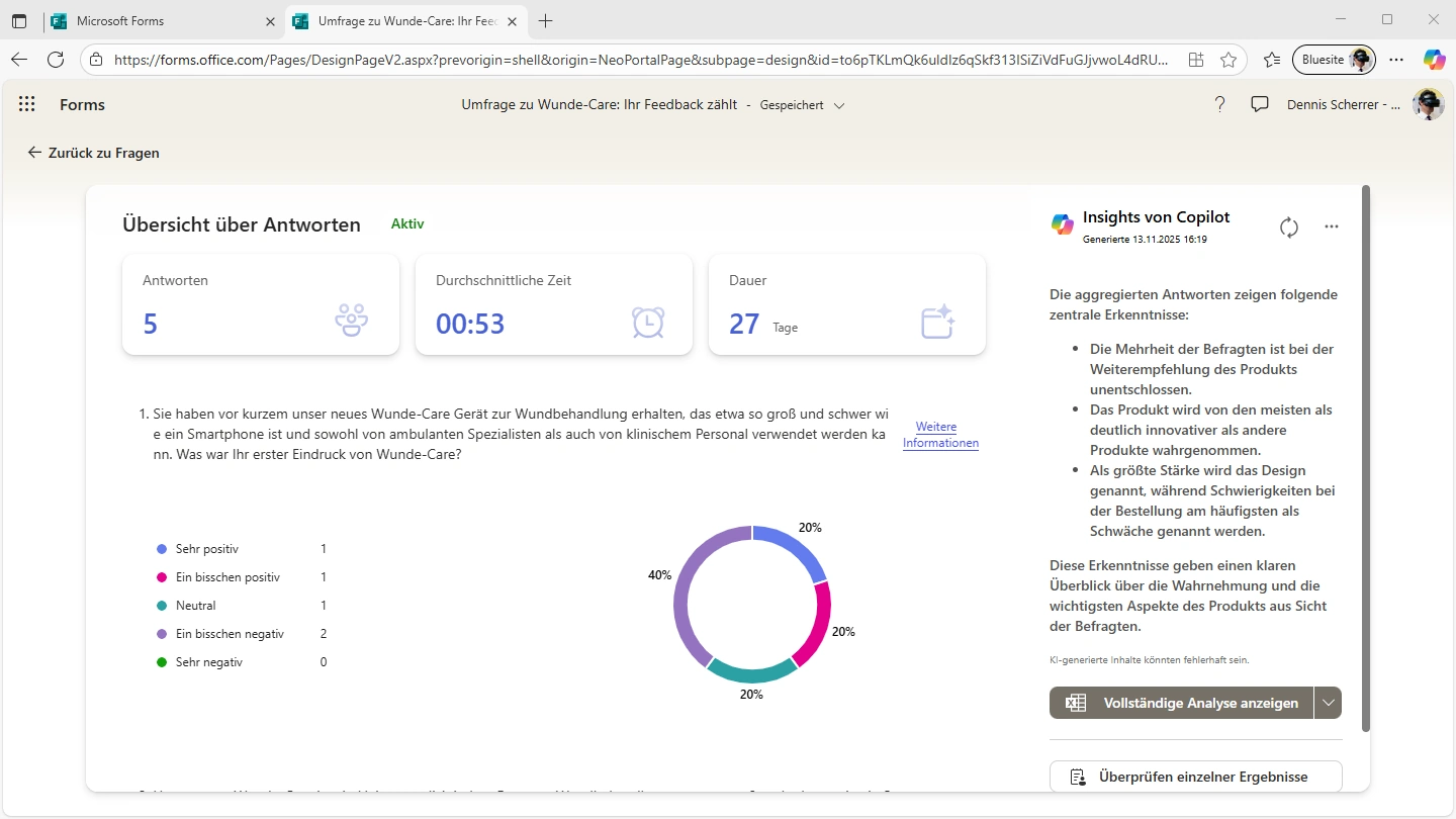 Der Screenshot zeigt einem Webbrowser mit zwei Tabs. Der linke Tab trägt den Titel "Microsoft Forms". Der rechte, ausgewählte Tab den Titel einer Umfrage die mit Microsoft Forms erstellt wurde. Rechts neben der Überschrift "Übersicht über Antworten" steht "Aktiv", und darunter sind drei Felder mit Antworten = 5, Durchschnittliche Zeit = 00:53 und Dauer 27 Tage. Darunter wird die erste Frage der Umfrage angezeigt und die Optionen zur Antwort. Jede Antwort hat eine andere Farbe. Rechts neben den Antworten ist ein Ring-Diagramm mit den Antworten und den jeweiligen Anteilen in Prozent. Rechts daneben ist eine Spalte mit der Überschrift "Insights von Copilot". Darunter ist ein mit Künstlicher Intelligenz generierte Text mit den Erkenntnissen aus der Umfrage. Rechts unten eine Schaltfläche "Vollständige Analyse anzeigen".