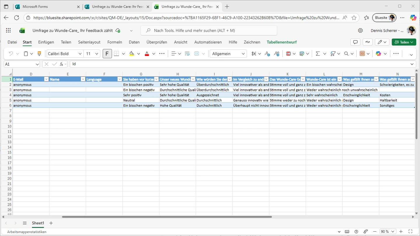 Bildschirmfoto – Excel für das Web mit Daten einer Microsoft Forms Kundenumfrage