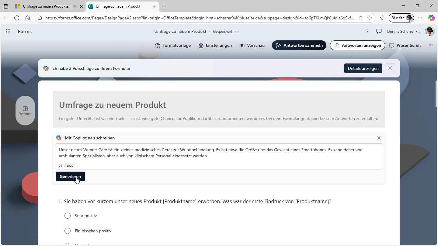 Der Screenshot zeigt Microsoft Forms im Microsoft Edge Webbrowser. Unterhalb von Titel und Untertitel ist ein großes Eingabefeld mit der Überschrift "Mit Copilot neu schreiben" zu sehen. Darin ist wurde eine mehrzeilige Anweisung eingegeben. Darunter steht der Mauszeiger auf der Schaltfläche "Generieren". Über dem Formular wird steht der Text "Ich habe 2 Vorschläge zu Ihrem Formular", rechts neben dem Text eine Schaltfläche "Details anzeigen". Darunter die Frage nach dem ersten Eindruck des Produktes und eine Liste von Auswahlmöglichkeiten (Optionen). Im linken Drittel werden unter der Überschrift "Aus empfohlenen Vorlagen erstellen" mehrere Miniaturbilder gezeigt. Über dem Formularentwurf ist das Copilot-Symbol mit dem Hinweis auf Verbesserungsvorschläge. Darüber wird eine Menüleiste angezeigt. Über der Menüleiste zentriert steht der Titel des Formulars, rechts das Benutzerkonto und links der Text "Forms".