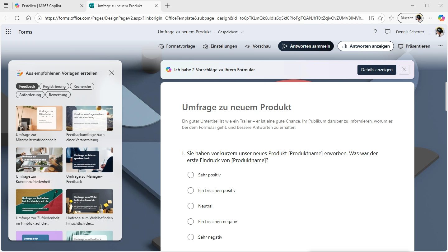 Der Screenshot zeigt Microsofts Edge Webbrowser. In der Adresszeile ist die die URL "https://forms.office.com" und im Titel des Tabs der Text "Umfrage zu neuem Produkt" zu erkennen. Die Abbildung wird im rechten Drittel dominiert von einem Formular mit der Überschrift "Umfrage zu neuem Produkt". Darunter die Frage nach dem ersten Eindruck des Produktes und eine Liste von Auswahlmöglichkeiten (Optionen). Im linken Drittel werden unter der Überschrift "Aus empfohlenen Vorlagen erstellen" mehrere Miniaturbilder gezeigt. Über dem Formularentwurf ist das Copilot-Symbol mit dem Hinweis auf Verbesserungsvorschläge. Darüber wird eine Menüleiste angezeigt. Über der Menüleiste zentriert steht der Titel des Formulars, rechts das Benutzerkonto und links der Text "Forms".