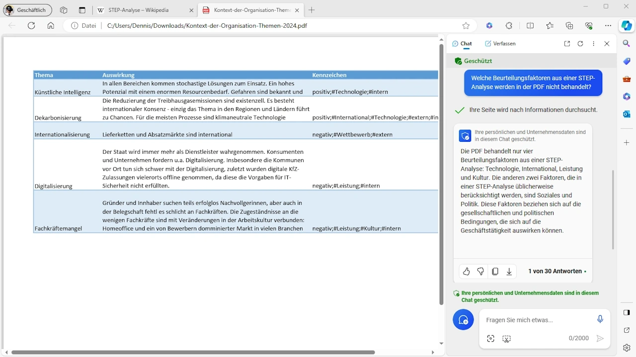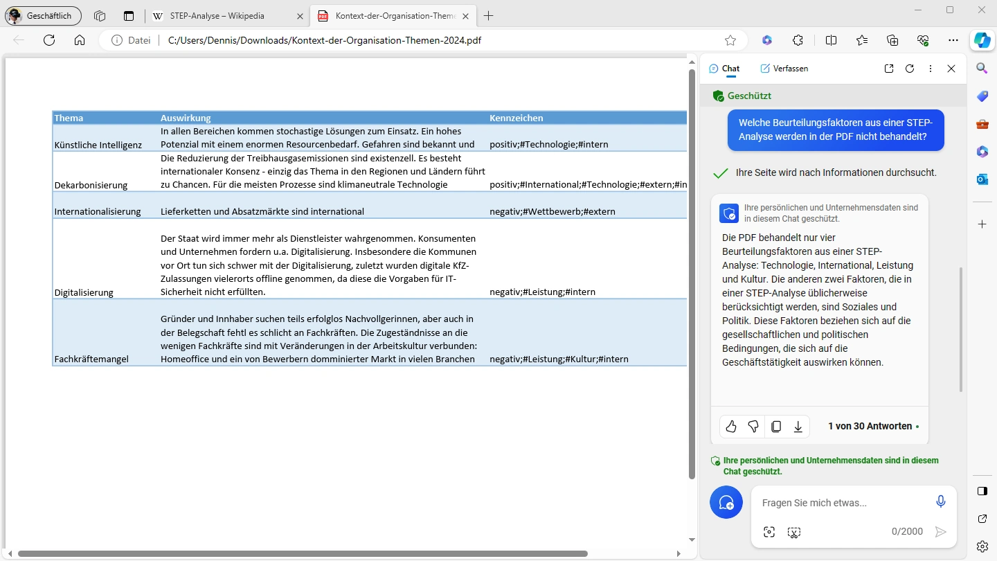 Copilot in Word bspw. nimmt bis zu drei Dokumente im Prompt an1. Damit könnten Sie neben Ihrer Liste der Themen und des Artikels zur STEP-Analyse auch den Normentext als PDF einem Bericht zu den aktuellen Themen der Organisation hinzuzufügen.