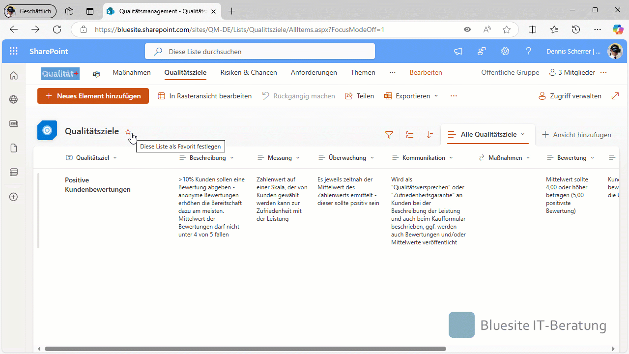 Wenn Sie mit einer der fünf Qualitätsmanagementsystem-Listen besonders häufig arbeiten, fügen Sie diese als Favorit in Microsoft 365 hinzu. Favoriten erleichtern es Ihnen wie Lesezeichen bekannte Informationen zu finden.