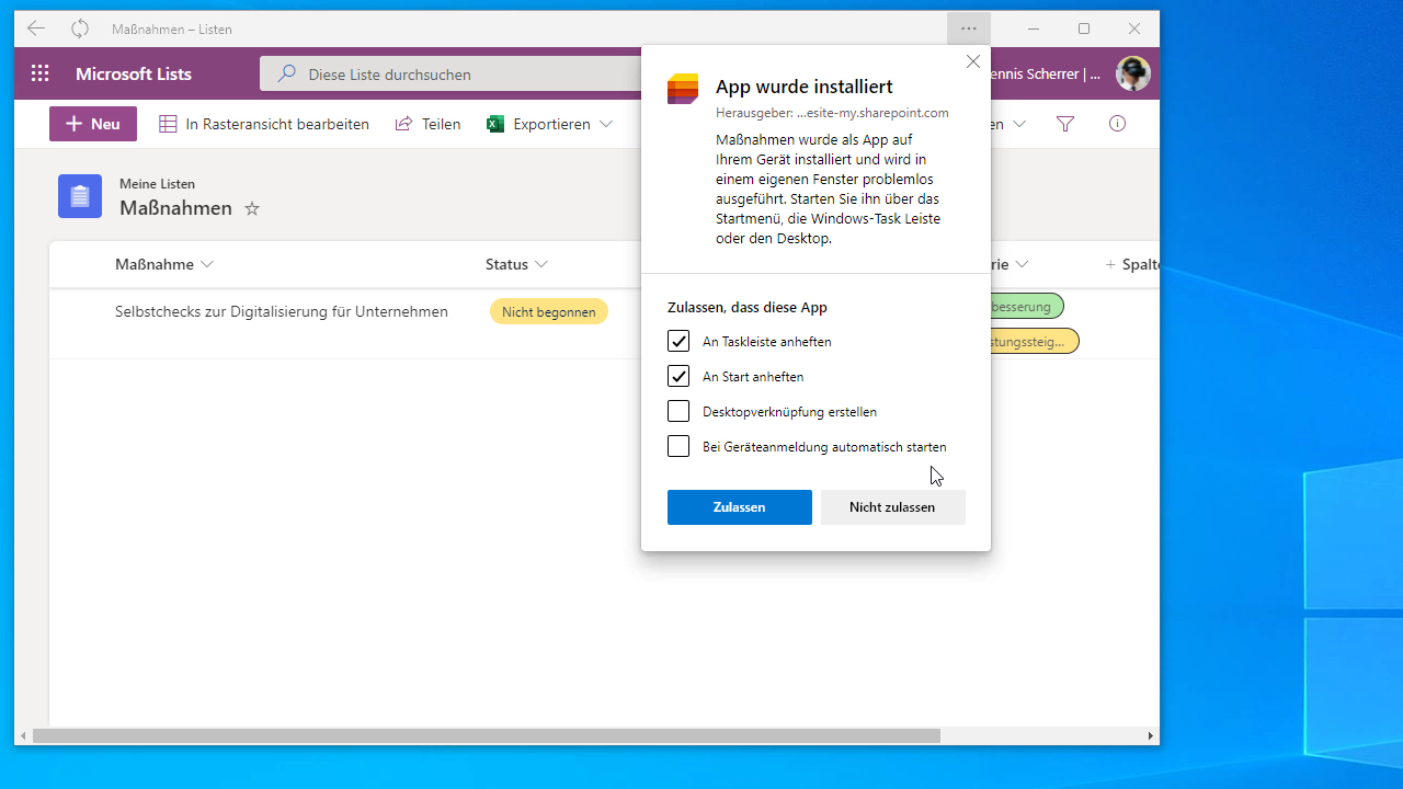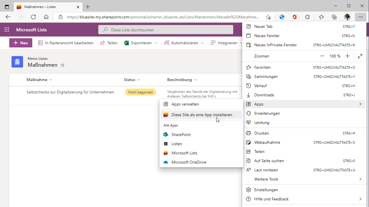 Fügen Sie dazu einfach die gewünschte Liste des Qualitätsmanagementsystems im Edge Browser als App hinzu.