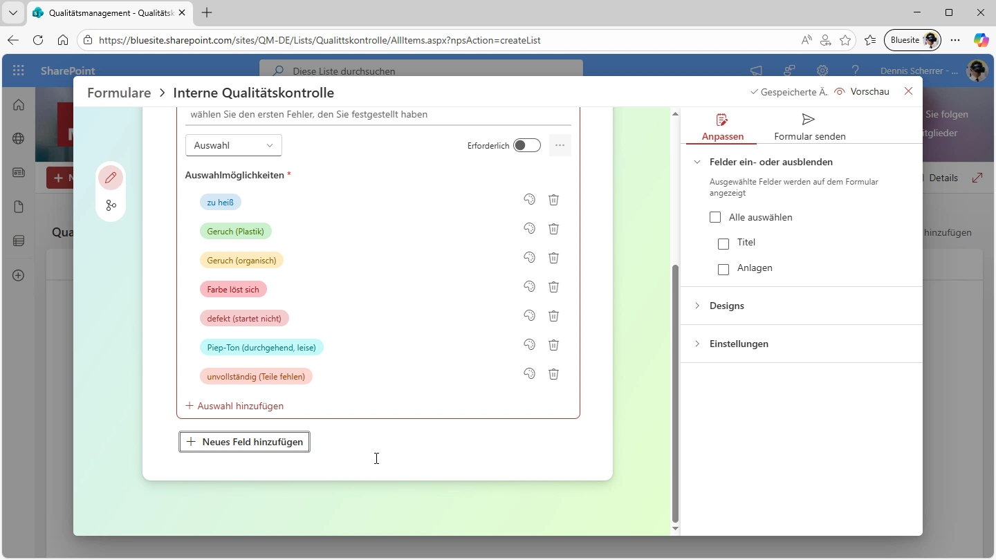 Erstellen Sie bei einer SharePoint-Website ein “Listenformular” mit einer Auswahl an möglichen Fehlern. Anders als bei Umfragen mit Forms, ist der Zugriff auf Listenformulare in Microsoft 365 nur für Personen in Ihrem Unternehmen möglich. Besuchern (beispielsweise Lieferanten) können Sie optional die Berechtigung für das Umfrageformular erteilen. Nicht aber beispielsweise anonymen Kunden.