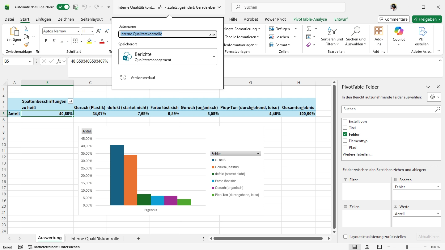 Tipp: speichern Sie die Excel-Mappe mit dem Kombidiagramm in der “Berichte”-Bibliothek Ihre SharePoint-Website für das Qualitätsmanagement