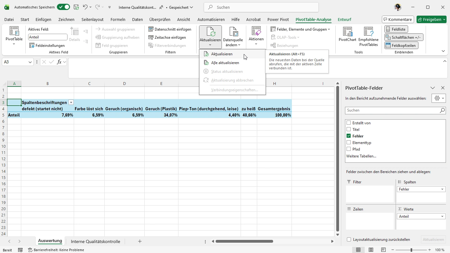 Klicken Sie im Menü “Einfügen” auf PivotTable. Fügen Sie die Spalte “Fehler” den Bereichen für Spalten und Werte hinzu. Nehmen Sie die Einstellungen für die Werte-Anzeige in % vor.