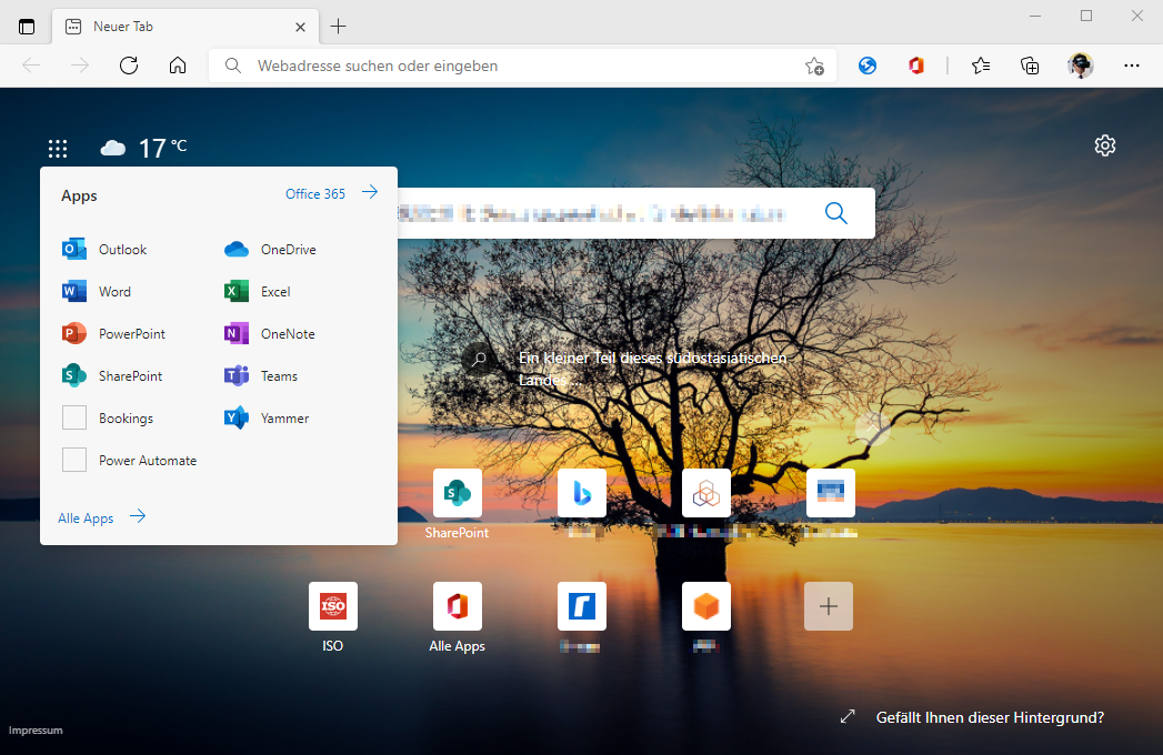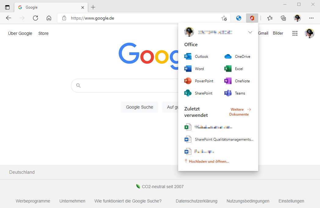 Der Google Startseite fehlt natürlich das App-Startfeld (siehe Bildschirmausschnitt 2 unten) von Microsoft Office. Wer auf den schnellen Zugriff auf Office-Dateien nicht verzichten möchte installiert sich die Office-Browsererweiterung1 (siehe Bildschirmausschnitt 1 oben) von Microsoft.