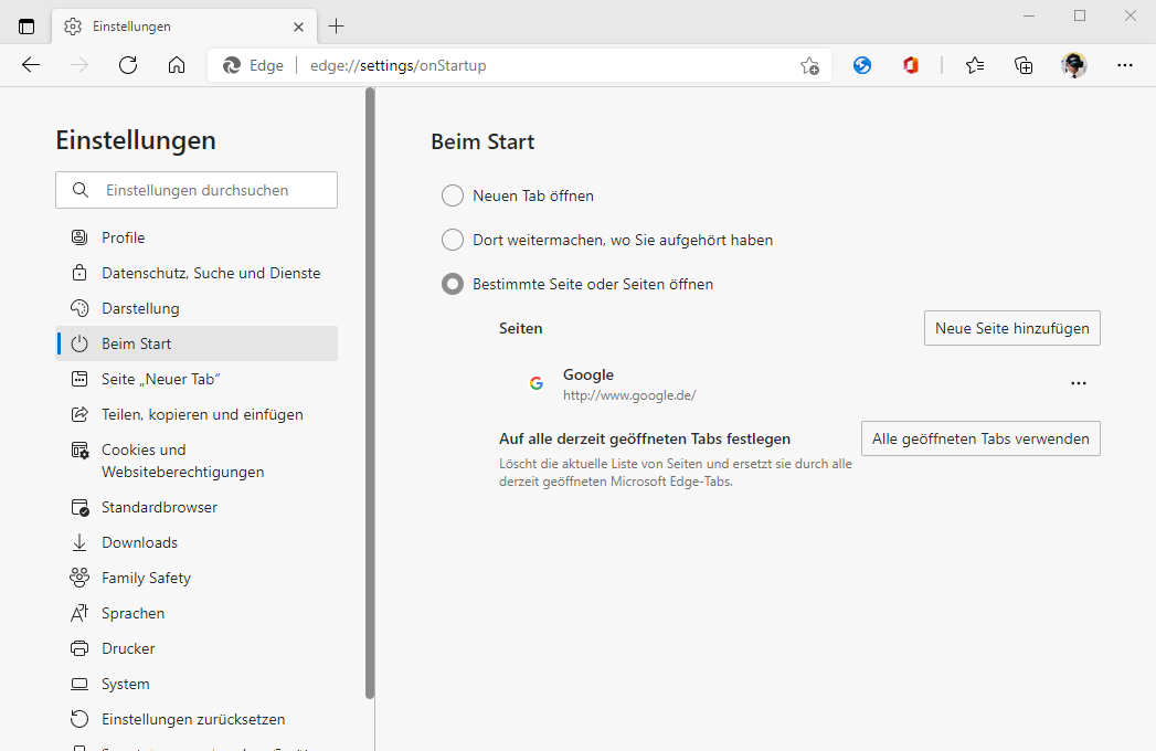 Um sich Google als Startseite im Edge Webbrowser einzustellen gibt man in der Adressleiste einfach edge//settings/onStartup ein (siehe Bildschirmausschnitt 3).
